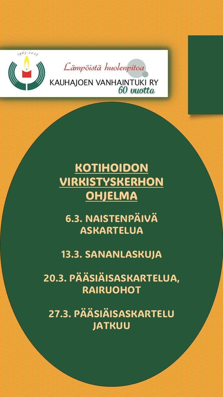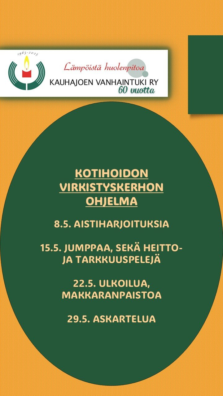 Ohjaajana toimii kotihoidon hoitaja Tiina Hakanen. Ohjelmassa muun muassa ulkoilua, kuntouttavaa toimintaa, bingoa, askartelua ym. erillisen ohjelman mukaisesti. Vaihtuva ohjelma päivitetään sivuille kerran kuukaudessa.